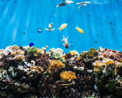 a group of seahorses are swimming in an aquarium